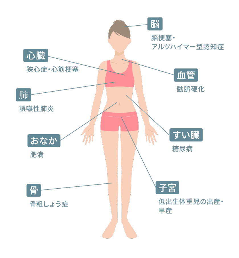 お口の中で炎症が続くと、細菌や炎症物質が全身に広がりやすくなることがあり、身体の健康に影響を及ぼす可能性があります。