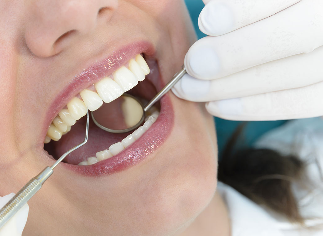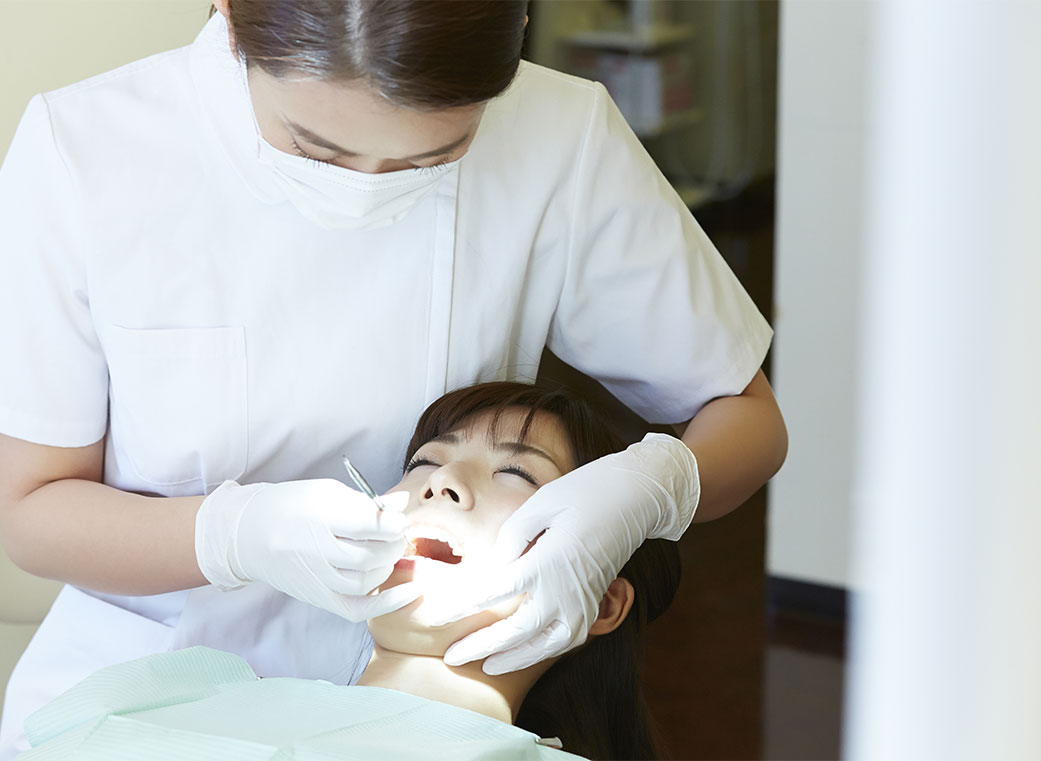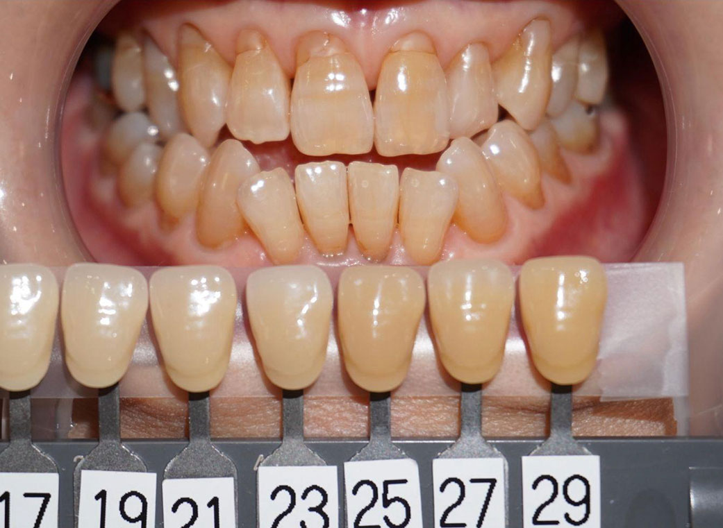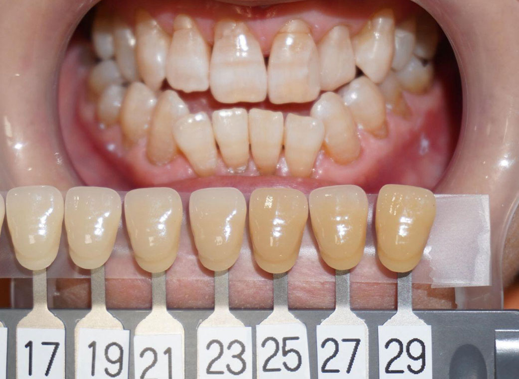 むし歯や歯周病の有無、お口にトラブルがないか口腔内を確認し、VITAシェードガイドで歯の色を測定します。